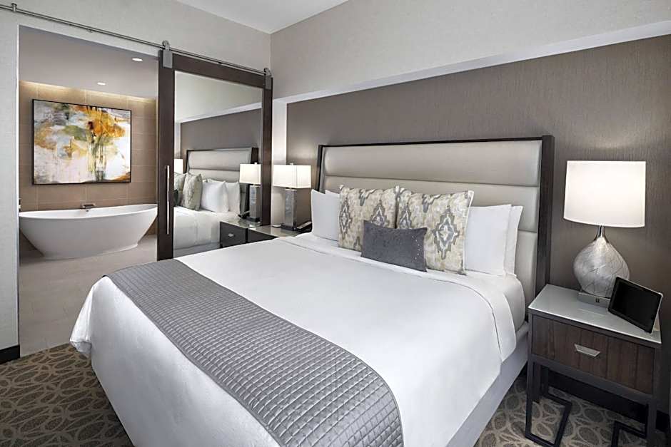 This one-bedroom suite features a 55-inch TV with streaming channel access and a separate living area. Bath amenities, a sculpted bathtub and a coffee maker are provided as well. An in-room tablet allows guests the opportunity to book spa appointments, order in-room dining or contact the valet.