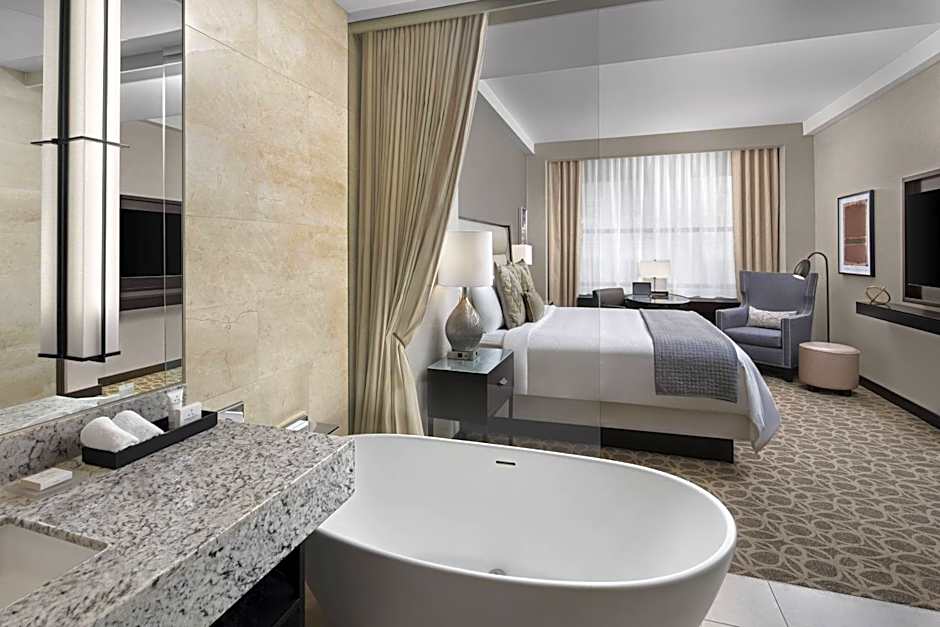 This room features a 55-inch TV with streaming channel access and a sculpted bathtub. Bath amenities and a coffee maker are provided as well. An in-room tablet allows guests the opportunity to book spa appointments, order in-room dining or contact the valet.