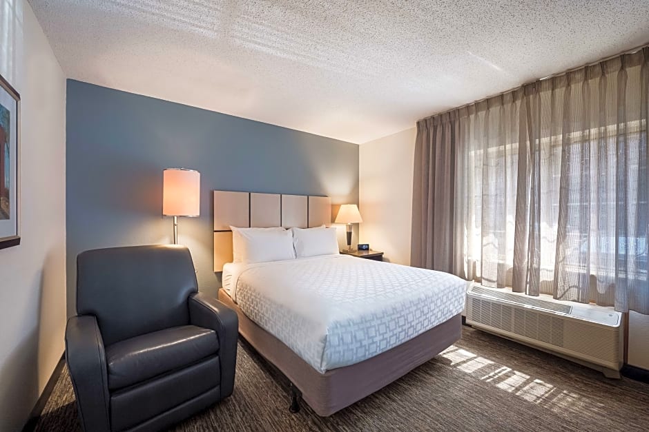 The hotel offers several types of rooms including Studio Queen Suites, One-Bedroom Queen Suites with Bathtub or Roll-In Shower, One-Bedroom Queen Suites, and Queen Rooms. The rooms range in size from 355 sqft to 527 sqft. Smoking is not allowed in any of the rooms. The occupancy varies, with some rooms accommodating 2 adults and 1 child, and others accommodating 3 adults and 2 children. The bed size for all rooms is a Queen size bed, except for the One-Bedroom Queen Suite which also includes a Sofa Bed.