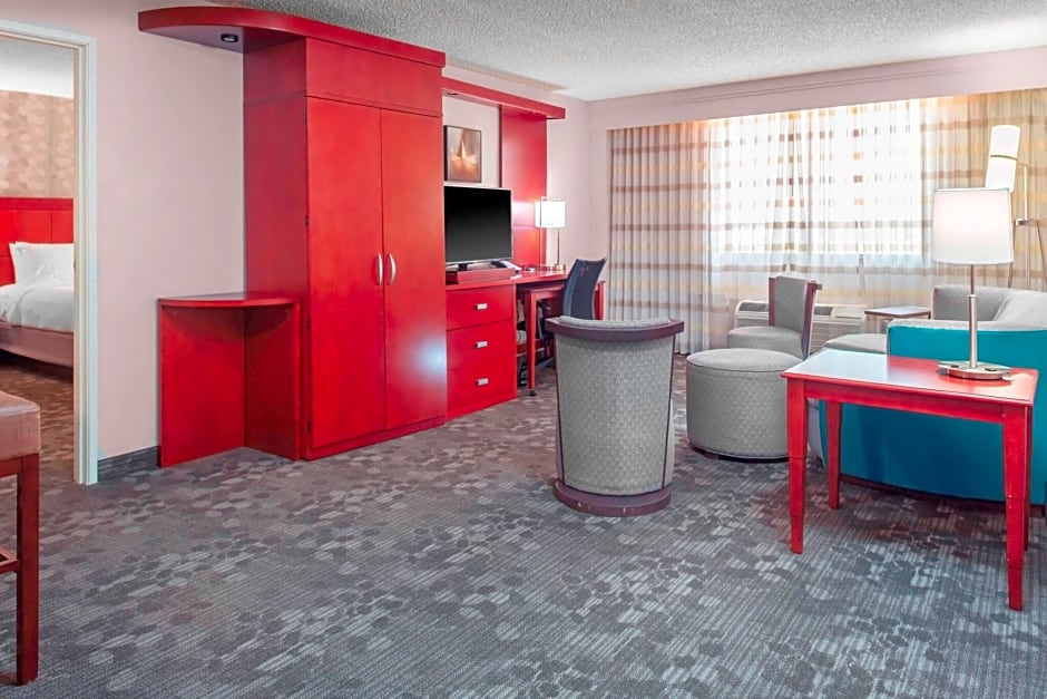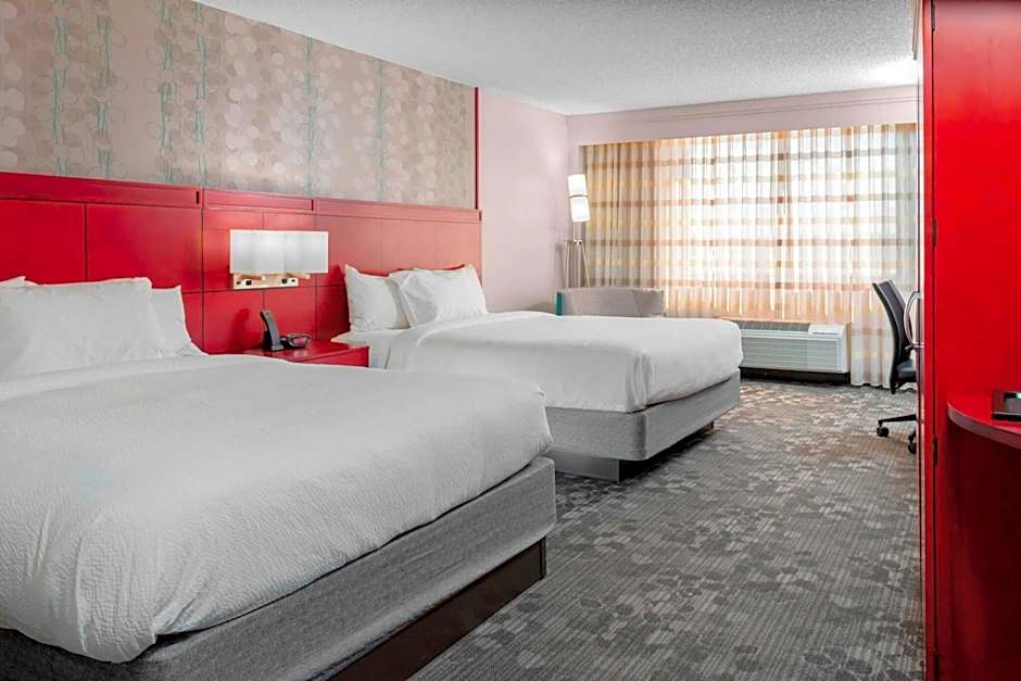 The hotel offers a One-Bedroom King Suite with a room size of 495 sqft, accommodating 2 adults and 1 child. Smoking is not allowed in this suite, which features a King size bed. The Queen Room with Two Queen Beds is a Double room with a room size of 388 sqft that accommodates 4 adults and 3 children. Smoking is not allowed in this room, and it has two Queen size beds. Another Double room option is the King Room with Sofa Bed, with a room size of 323 sqft. This room can accommodate 4 adults and 3 children and has a King size bed.