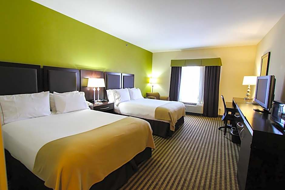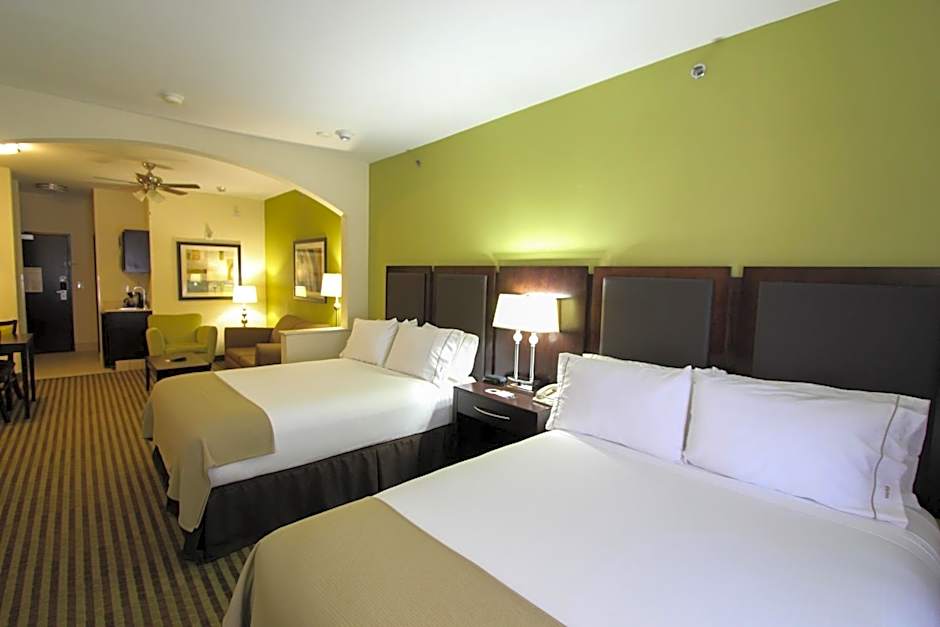 The Holiday Inn Express Hotel & Suites offers a variety of rooms including Twin Rooms, King Rooms, Queen Suites, and King Suites. The rooms have different occupancy capacities ranging from 2 adults and 1 child to 6 adults and 4 children. Smoking is not allowed in any of the rooms. The bed sizes vary with options including Twin beds, Queen beds, and King beds. The room sizes are 323 sqft for most rooms, and there are some rooms with mobility and hearing accessibility features.