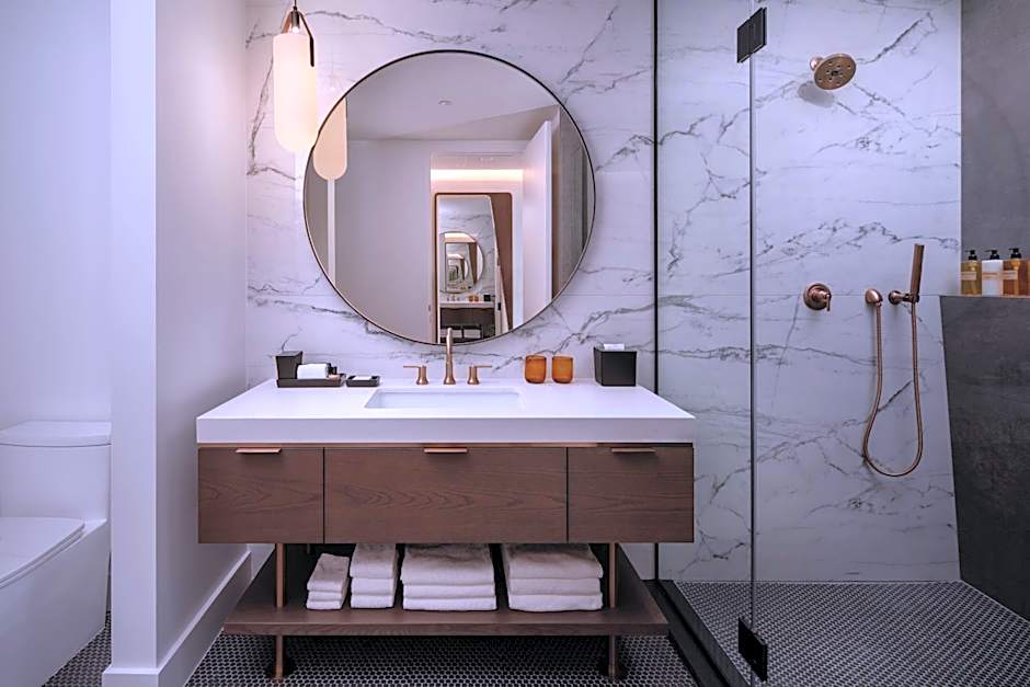 The outdoor heated infinity pool sits atop the building, offering a rooftop view with a shallow end for easy lounging. An adults-only atmosphere ensures a serene backdrop for sunset swims, while a sun deck and bar provide the perfect perch to soak up the city’s vibes.