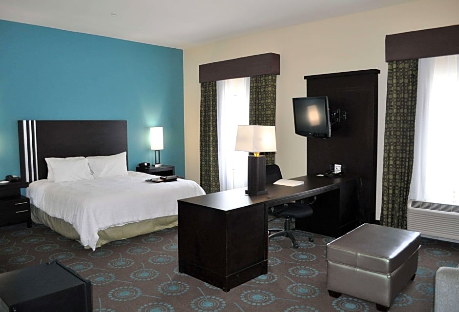 The Hampton Inn Pleasanton offers a variety of room types including Queen Rooms with Two Queen Beds, King Rooms, and King Studio Suites. All rooms are non-smoking. The Queen and King Rooms accommodate up to 5 adults and 4 children, while the King Studio Suite accommodates up to 3 adults and 2 children. The Queen Room with Two Queen Beds also has a disability access option.