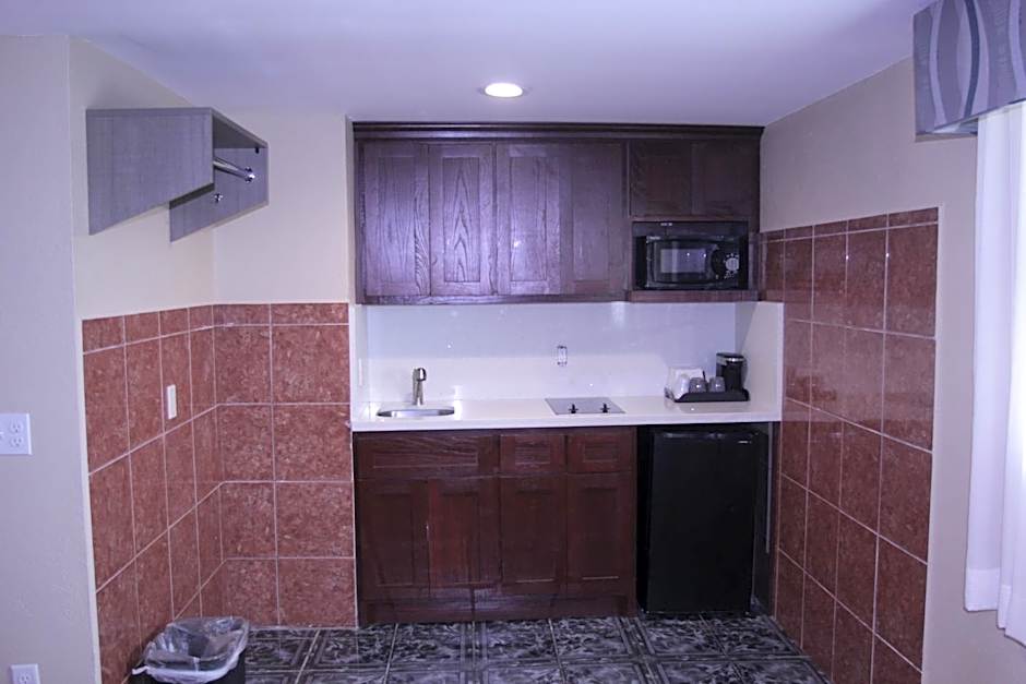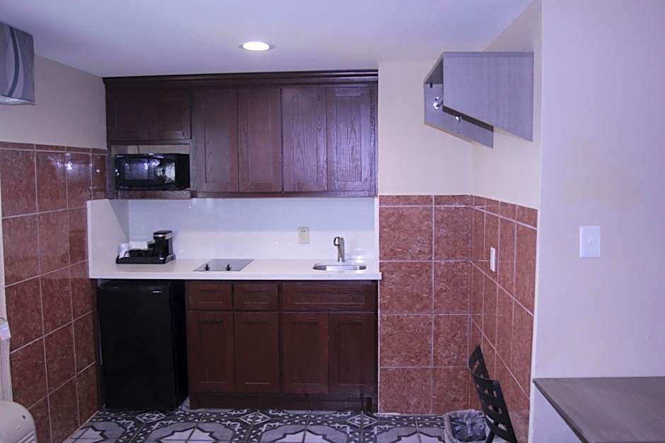 A kitchen with a microwave, fridge, and stove top is featured in this room. A cable TV is also provided.