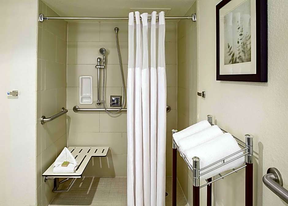 A cable TV with movie channels is featured in this accessible room. A coffee machine and work desk are also provided. In the bathroom you will find complimentary toiletries and a roll-in shower with shower chair.
