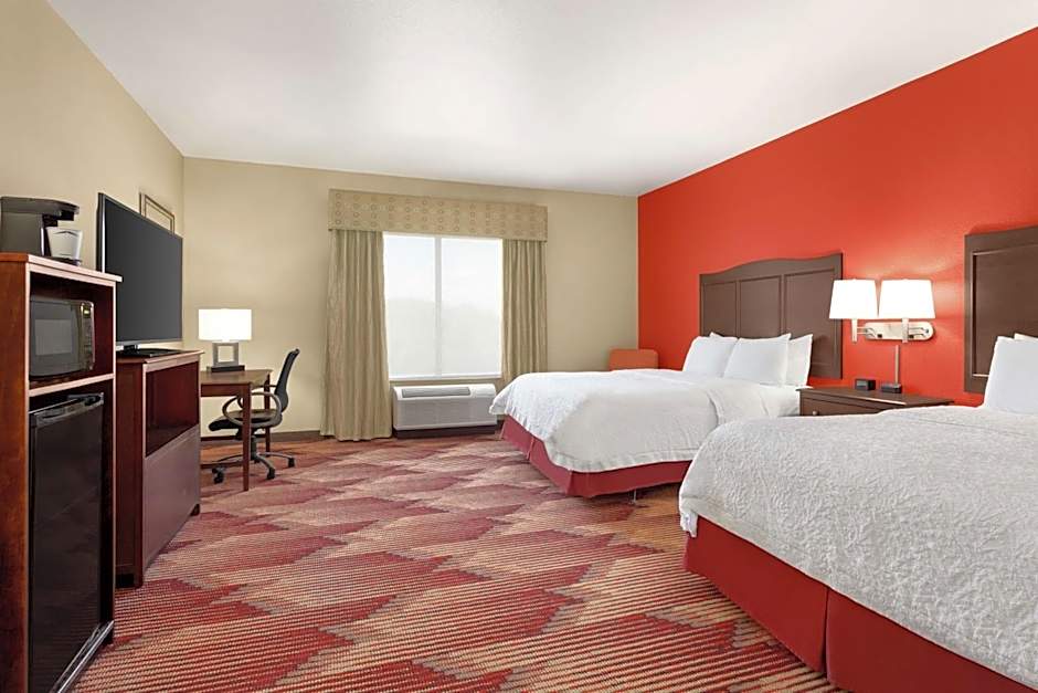 The Hampton Inn Sulphur Springs offers a variety of room types including King Studios, King Rooms with Sofa Beds, and Queen Rooms with Two Queen Beds. All rooms are non-smoking and range in size from 258 to 420 square feet. Occupancy varies from triple to quadruple, accommodating 3 to 5 adults and 2 to 4 children. Bed sizes include King and Queen beds, with some rooms also featuring a sofa bed.
