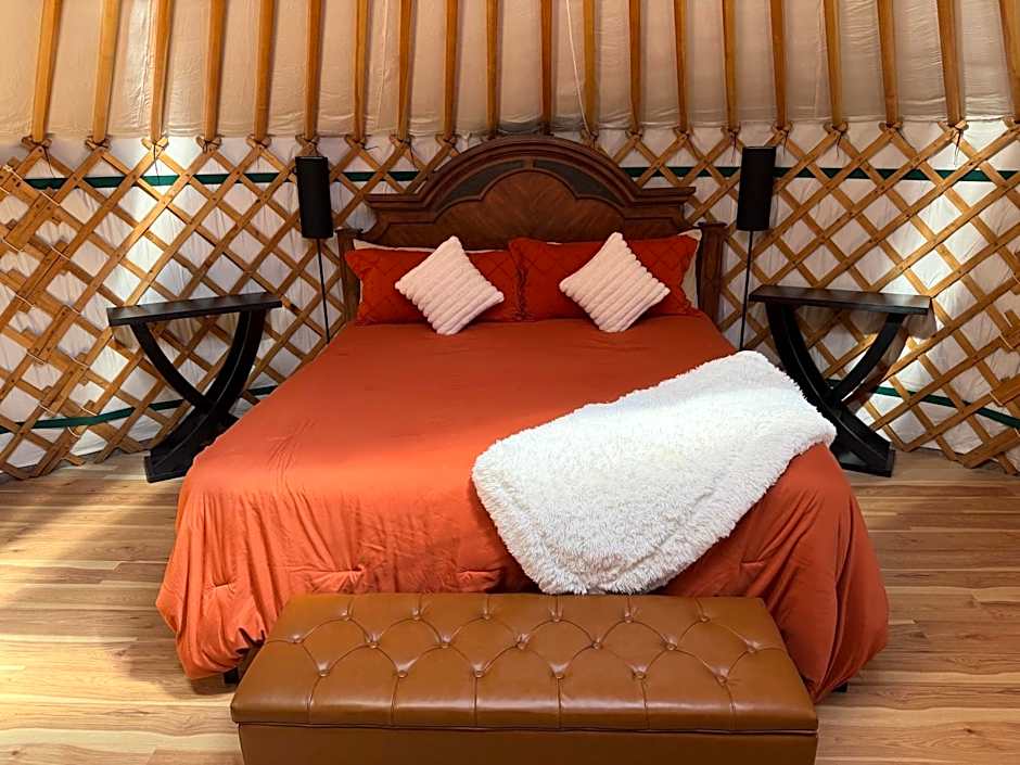 Traditional Mongolian yurt, with a queen bed, table and chairs, and storage shelves inside. The yurt is located on a deck with seating and a charcoal grill, and is located adjacent to a private bathroom and outdoor propane-heated shower.