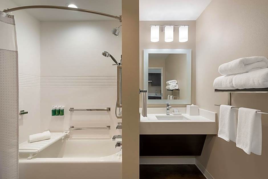 The hotel offers a variety of rooms including King Studio Suites with courtyard views and adapted tubs for mobility accessibility, Studios with 2 Queen beds and courtyard views, Studios with 1 King bed and a sofa bed, Queen Studio Suites with courtyard views for hearing accessibility, 1 Bedroom Suites with 1 Queen bed and a sofa bed, and King Studio Suites with courtyard views for hearing accessibility. All rooms are non-smoking and can accommodate 2 adults and 1 child.