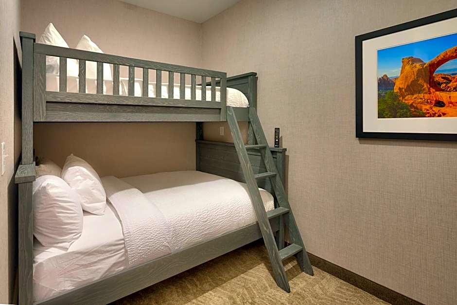 The SpringHill Suites by Marriott Moab offers a variety of suite options. The King Suite with Sofa Bed can accommodate 3 adults and 2 children, while the larger King Suite with Sofa Bed and Bunk Bed can accommodate 6 adults and 5 children. The Queen Suite with Two Queen Beds can accommodate 5 adults and 4 children. All rooms are non-smoking and feature different bed sizes.