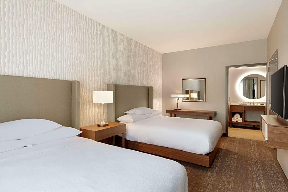 The hotel offers various types of suites and quadruple rooms. The suites include two-room queen suites with two queen beds, two-bedroom suites with two queen beds, two-room king suites, king suites with accessibility features for the hearing impaired, and a king studio suite. All rooms have a size of 334 sqft and do not allow smoking. The occupancy varies between 4 adults and 3 children for the king suites, and 6 adults and 4 children for the two-room queen and two-bedroom suites.