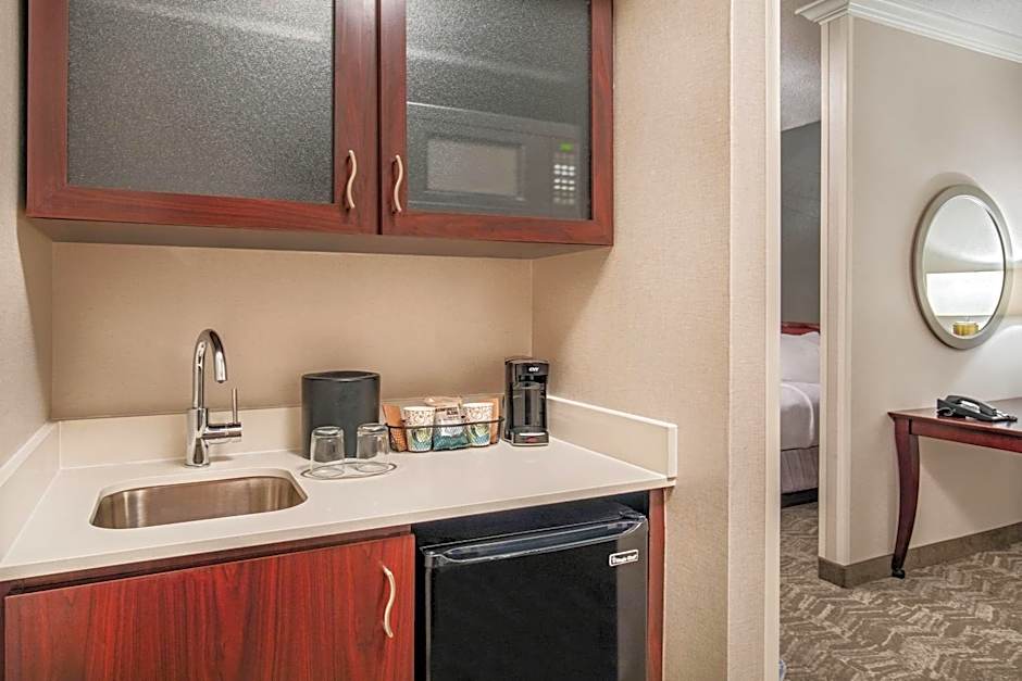 The suite features a seating area with a sofa bed, a wet bar with a refrigerator and microwave, and a work desk.