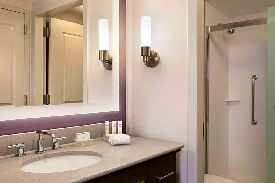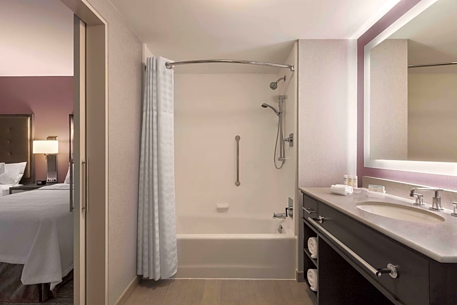 The suite has a kitchen with a refrigerator, stove top, microwave oven, coffee maker, dishwasher, plates, dinnerware and cooking utensils. Featuring a seating area with a sofa as part of the bedroom, this suite also has facilities like a roll-in shower making it wheelchair accessible as well.
