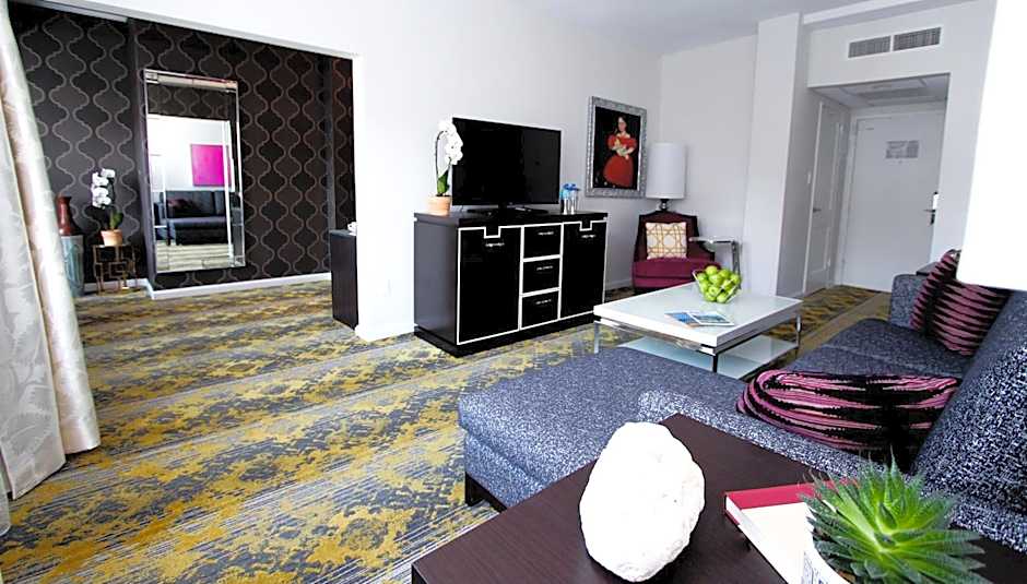 This spacious suite has separate sitting area with a flat-screen TV, sofa bed and desk.