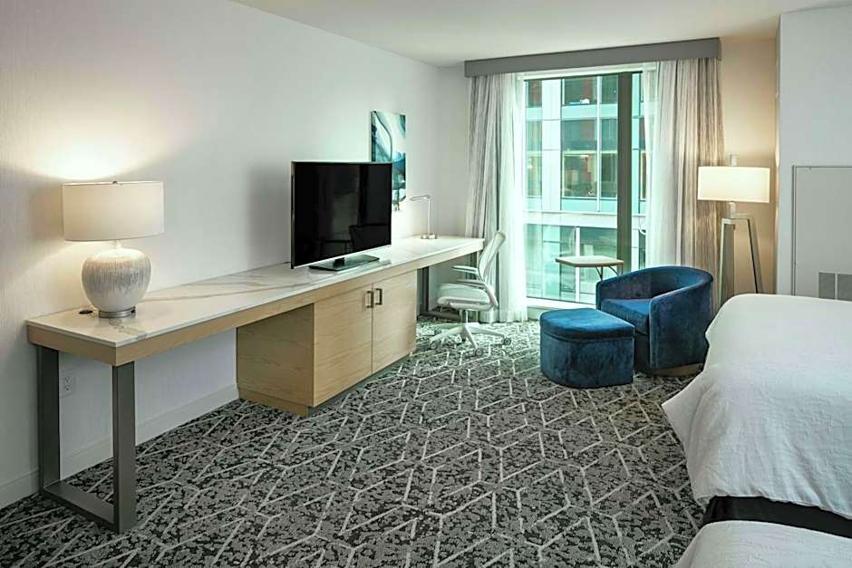 The Hilton Garden Inn Seattle Bellevue Downtown offers a variety of room options including suites, quadruple rooms, double rooms, and family rooms. All rooms are non-smoking and differ in size, with the largest being the One-Bedroom King Suite at 592 sqft. The rooms accommodate either 2 adults and 1 child or 4 adults and 3 children. Bed options range from 1 King size bed to 2 Queen size beds, and some rooms have accessibility features.