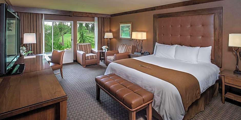 For events, meeting and banquet facilities are available, and a golf course is offered for an extra charge. Room options include a King Room with Patio and Pets Allowed, and a Room with 2 Queen beds and Patio (Pets Allowed). Both King and Queen rooms measure about 398 square feet, with non-smoking layouts and comfortable furnishings.