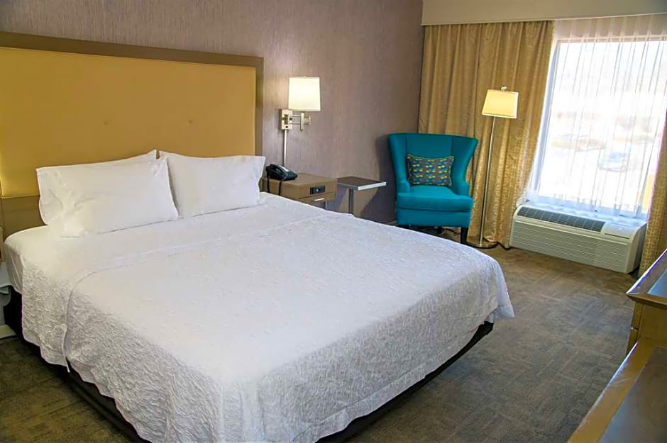 Easy chair with ottoman, 32-inch HDTV, work space, coffeemaker, free WiFi Unwind in this guest room which offers one king-sized clean and fresh Hampton bed®, a comfortable seating area and a 32-inch HDTV. Refresh in the bathroom with a WaterPik showerhead and fluffy towels. The curved shower rod provides extra space and light when showering. Work in comfort at the large desk and stay connected with free WiFi access. Additional amenities include a handy coffeemaker.