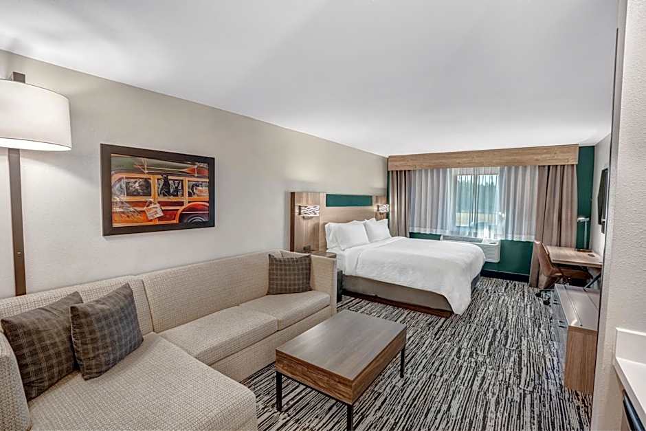 The Holiday Inn Express & Suites Hayward offers a variety of room types including King Suites, Location Suites, Suites with Views, Standard Rooms, and Queen Rooms with Lake Views. All rooms are non-smoking and range in size from 301 sqft to 431 sqft. Occupancy ranges from 2 adults and 1 child to 4 adults and 3 children, with bed options including King size beds and Queen size beds.