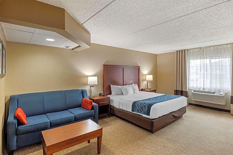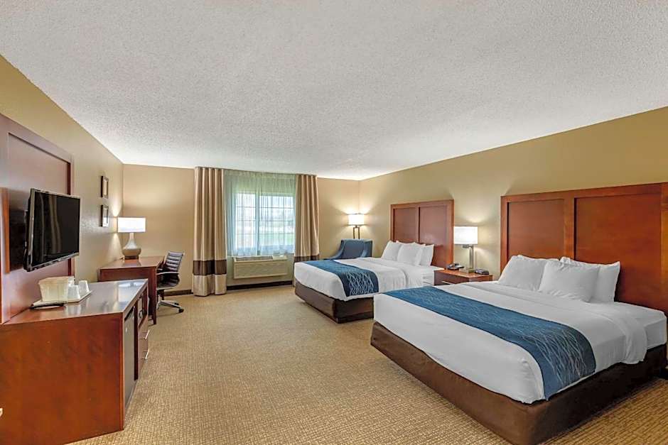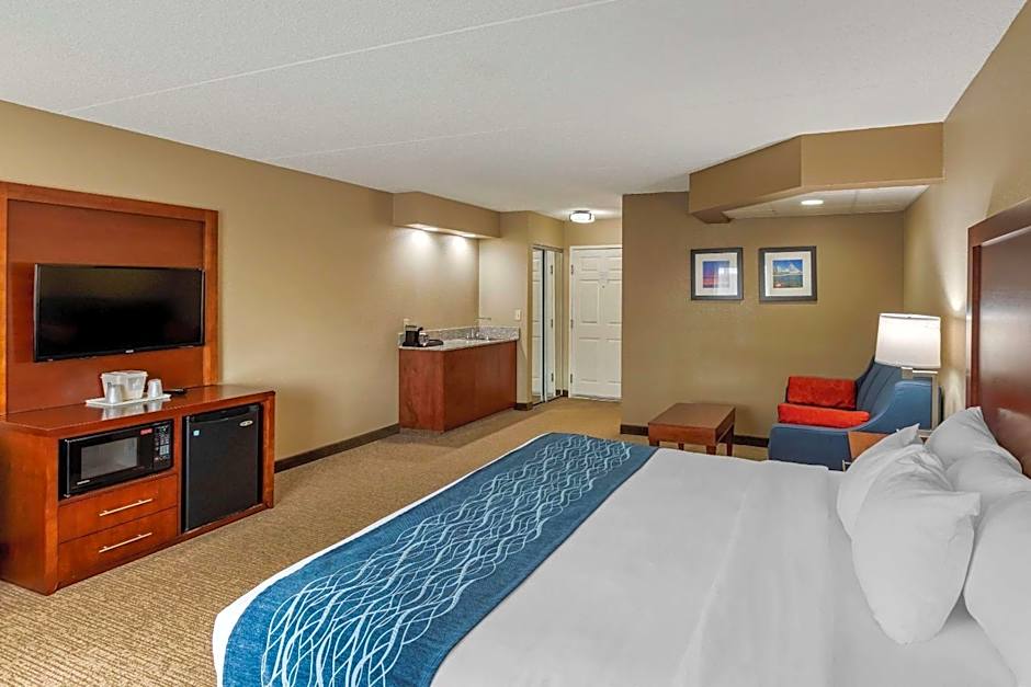 The Comfort Inn & Suites Jackson - West Bend offers a variety of room types including King Rooms with Sofa Beds, Queen Rooms with Two Queen Beds, Queen Suites, and King Rooms with Fireplaces. All rooms are non-smoking and can accommodate 4 adults and 3 children. The room sizes range from 355 sqft to 603 sqft.