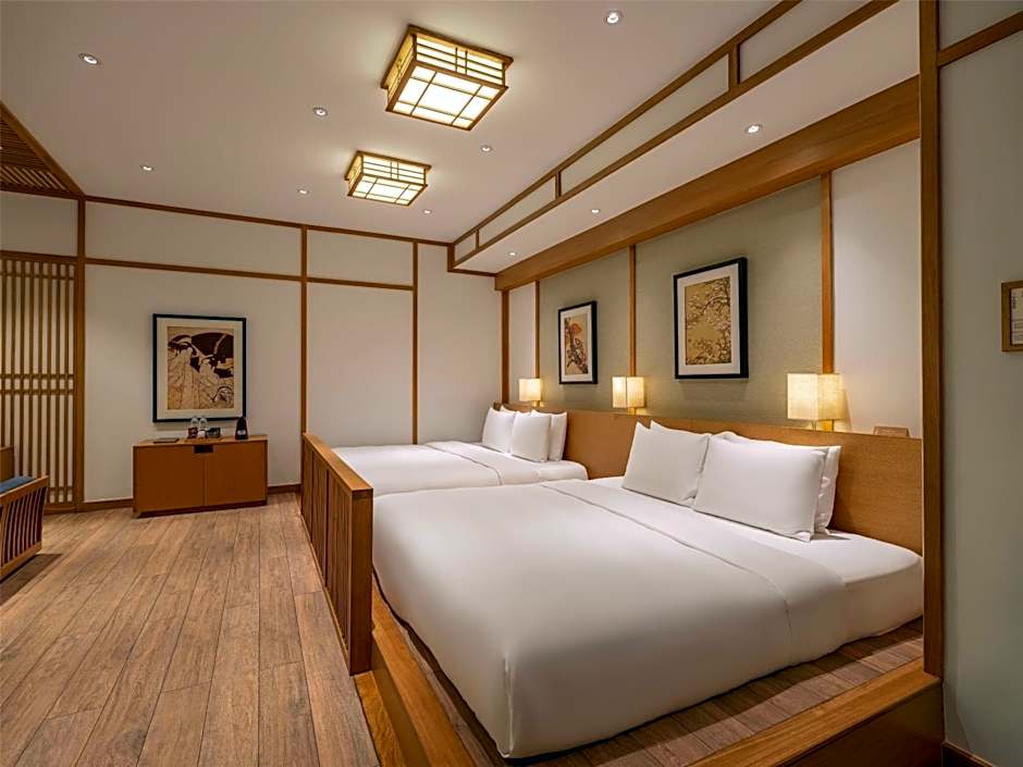 Accommodations span a diverse range, from compact Run Of House and Japanese-Style Rooms to multiple-bedroom suites and villas. Examples include a Room that accommodates 2 adults and 1 child, a Run Of House for 2 adults, a Suite with 1 bedroom and 2 queen beds (lounge access) for 2 adults, a Room, 3 Bedrooms accommodating 6 adults, a Superior Suite with 4 Bedrooms for larger groups, and a Villa with 5 Bedrooms for families or friends traveling together; all listed options are non-smoking.
