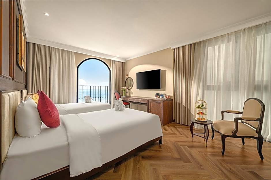 An adults-only outdoor rooftop infinity pool with a plunge and panoramic views crowns the hotel, open all season for year-round lounging and sunset moments over Da Nang.