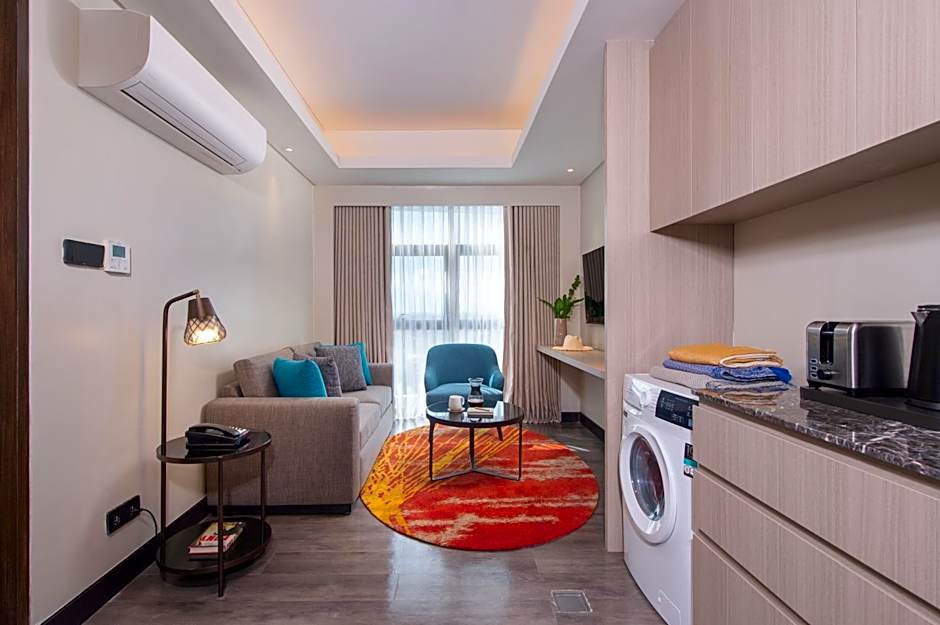 Apartment has a separate living area with LCD TV and sofa, It also has a kitchen and dining area.