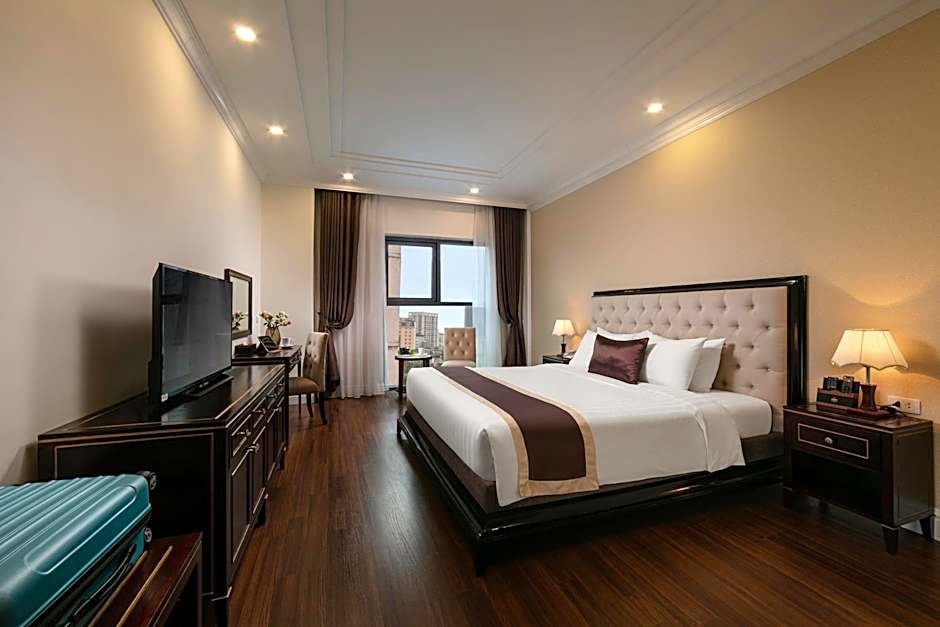 Adonis Hanoi Hotel offers Deluxe Twin Rooms with 2 twin beds, Deluxe Suites with 1 king bed, Superior Twin Rooms with 2 twin beds, and Executive Suites with Lake View featuring 1 king bed. All rooms can accommodate 2 adults and 1 child, do not allow smoking, and range in size from 312 to 570 sqft.
