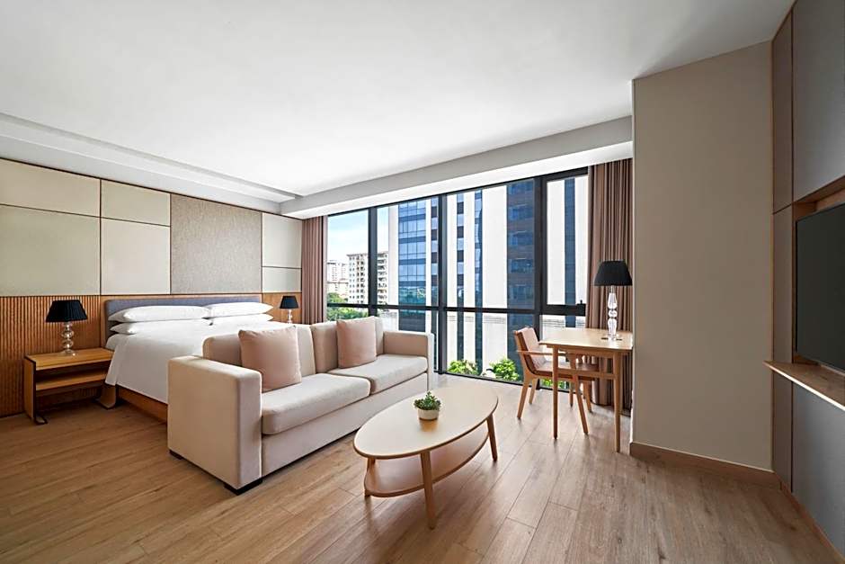 The studio features air conditioning, a washing machine, as well as a private bathroom boasting a bath and a shower. The studio has parquet floors, a seating area with a flat-screen TV, executive lounge access, a dining area as well as city views. The unit has 1 bed.