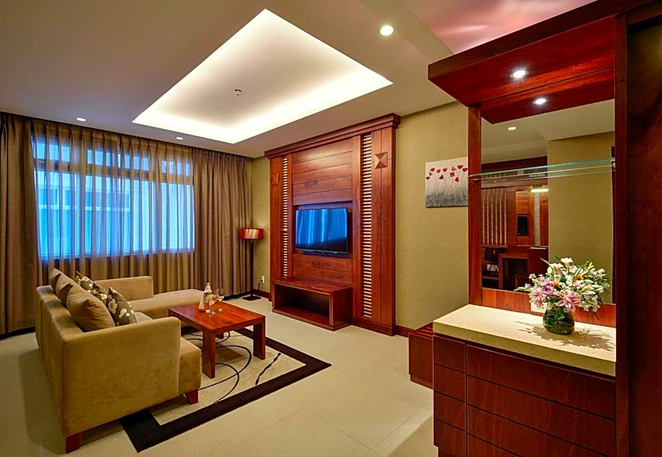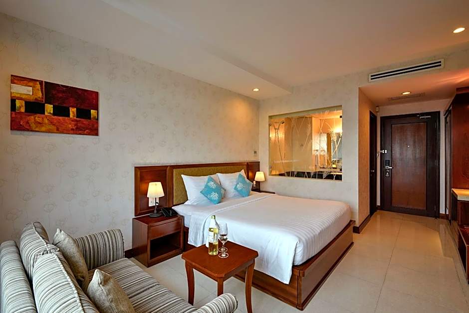 Spacious suite offering a seating area with sofa and a 46-inch LCD TV. The large window overlooks Saigon River. The private bathroom comes with a spa bath.