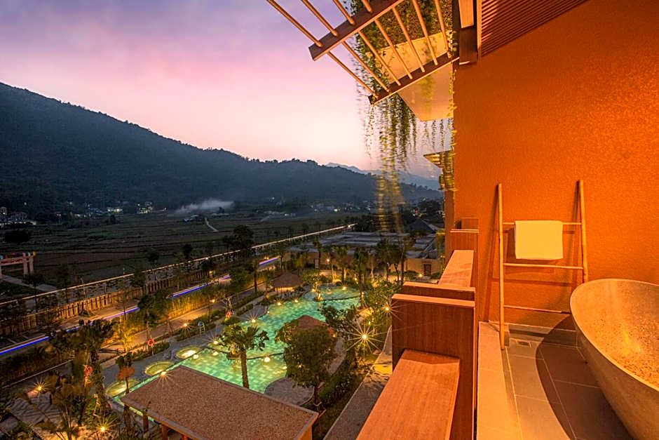 Located in Thon Mo Da, Thi Tran Bo, Huyen Kim Boi, Tinh Hoa Binh, this hotel sits within Vietnam’s scenic landscape, about from Hòa Bình city center. Mountain and garden views frame the property, complemented by family-friendly touches such as a Kids' club (free) and a Playground for younger guests. Book your stay to enjoy a polished, 5-star experience at this address.