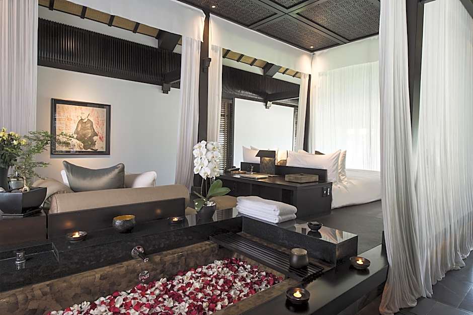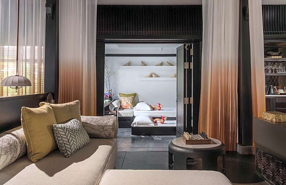 This spacious one-bedroom villa consists of a raised central platform and separate attached children's room fitted with a sofa bed, TV and gaming console, board games and children's amenities. At the back, the main bathroom opens out to a private garden and comes equipped with an outdoor rain shower.