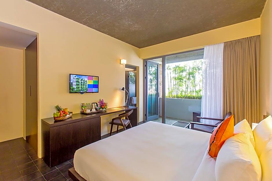 Room features a window and balcony with panoramic pool and garden views, an open-concept bathroom with a walk-in rainfall shower or separate bathtub, bathrobes, slippers and hairdryers. Amenities include a mini-bar, telephone, flat-screen satellite TV with international channels.