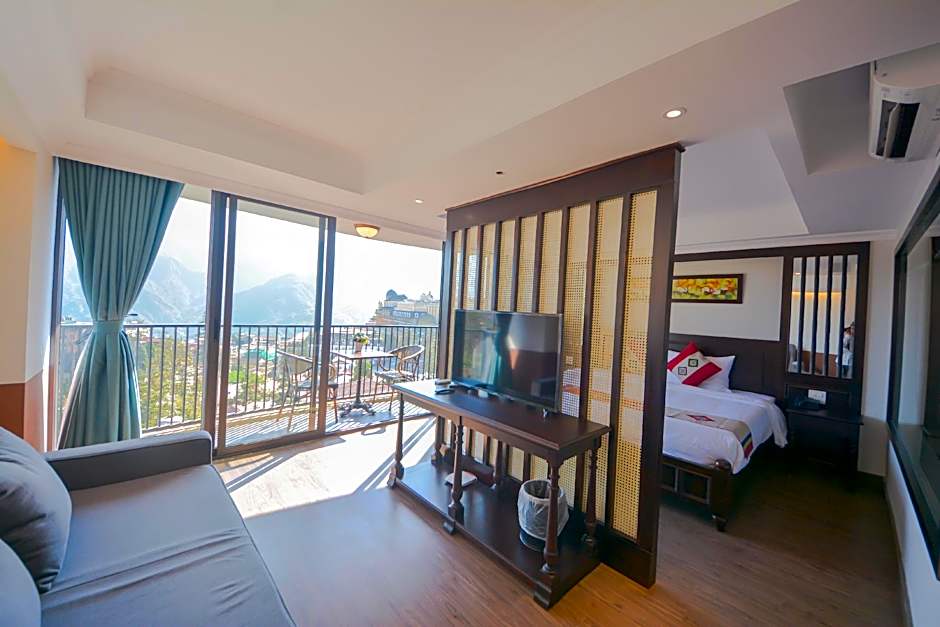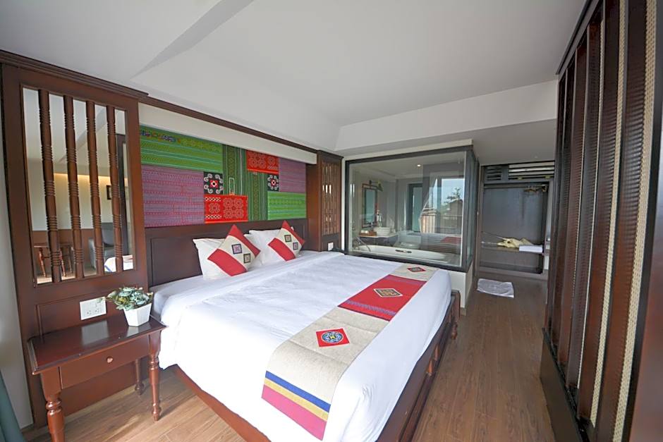 This spacious suite features a private balcony, cable TV and mini-bar. It offers great views of the Fansipan Mountt, Dragon Jaw Mount, Muong Hoa Valley and Sapa Town. The room is fitted with a king size bed and a living room.